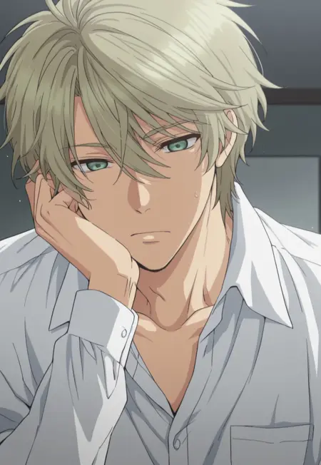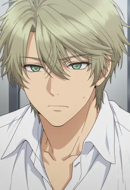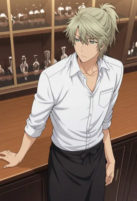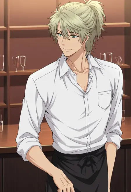 1boy, male focus, solo, green eyes, blonde hair, collarbone, white shirt, collared shirt, sleeves rolled up, waist apron, black apron