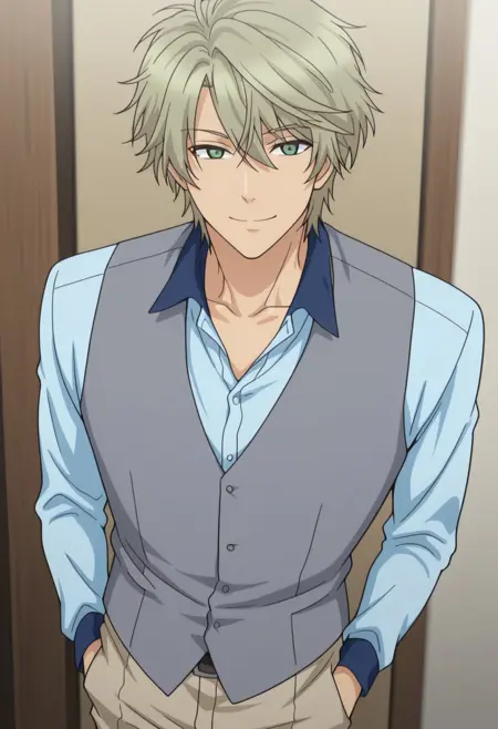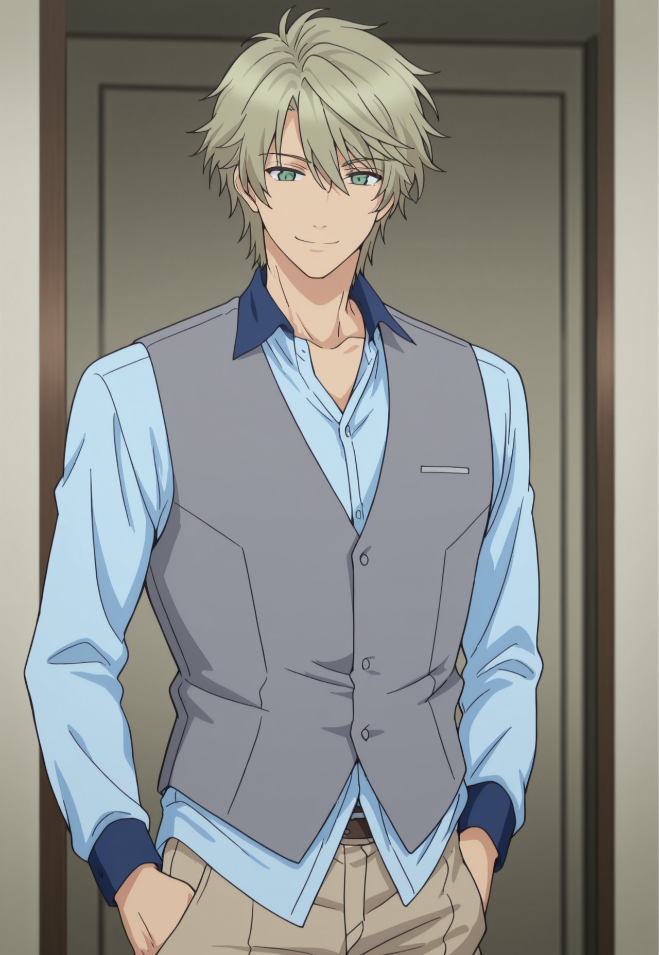 1boy, male focus, solo, green eyes, blonde hair, blue shirt, collarbone, collared shirt, long sleeves, grey vest, brown pants,