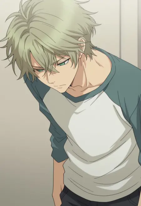 harukaido, 1boy, male focus, green eyes, shirt, blonde hair, pants, blue shirt, pants, brown pants, brown shoes,