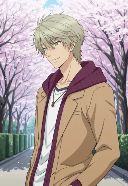 1boy, male focus, solo, green eyes, blonde hair, necklace, collarbone, white shirt, purple hoodie, open hoodie, hood, brown jacket, open jacket, belt, brown pants,