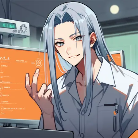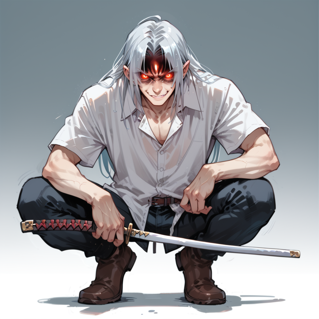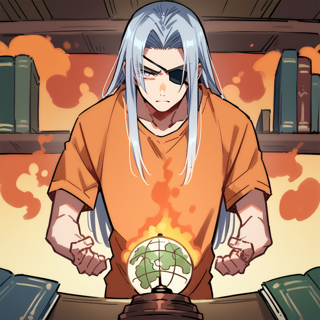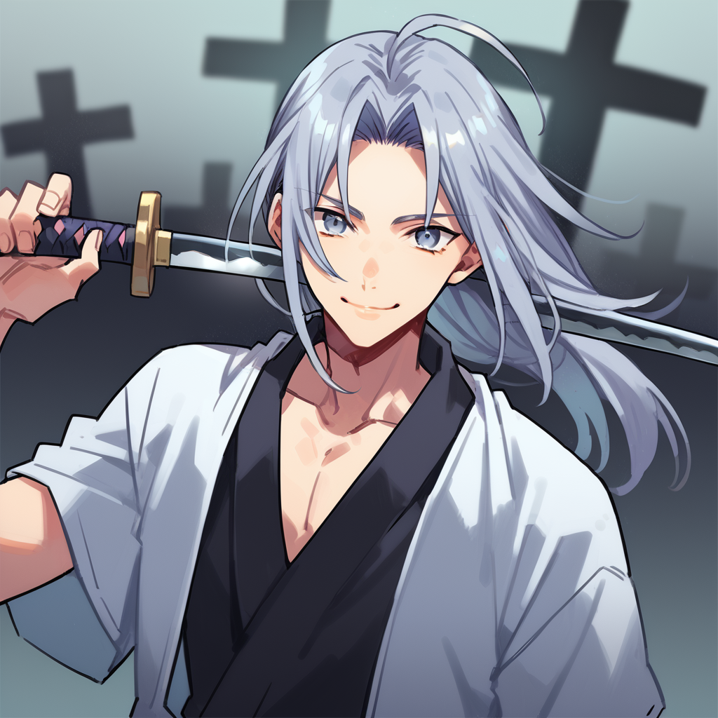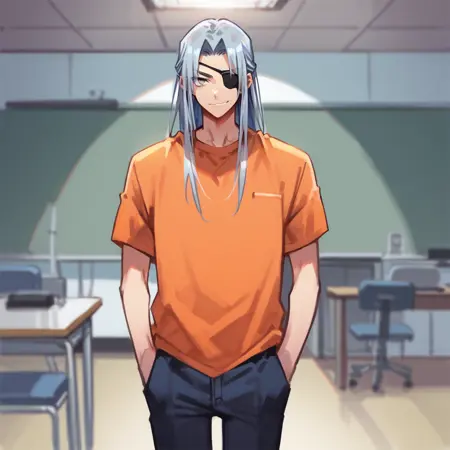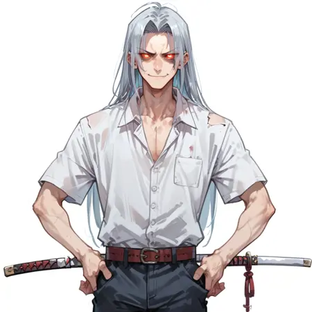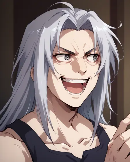 score_9, score_8_up, score_7_up, score_6_up, source_anime, shin natsume, tenjo tenge, 1boy, long hair, gray hair, grin, gray eye, eyepatch,