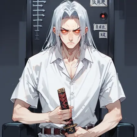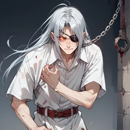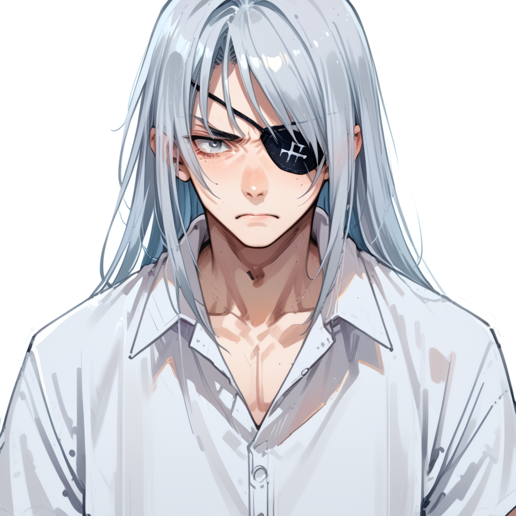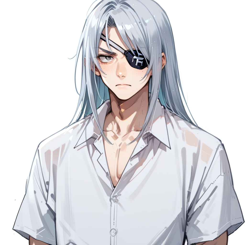 shin natsume, tenjo tenge, ah1, 1boy, long hair, gray hair, parted bangs, score_9, score_8_up, score_7_up, score_6_up, source_anime, white shirt, eyepatch, red eye, glowing eye, serious,