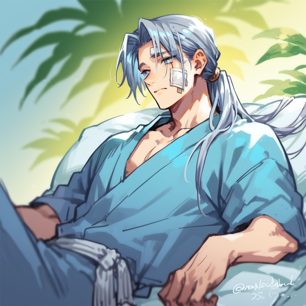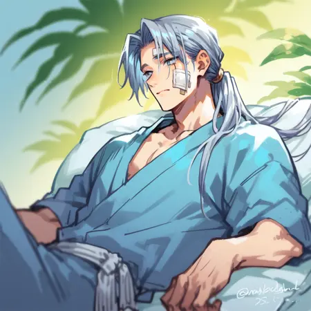 shin natsume, tenjo tenge, 1boy, long hair, gray hair, mouth closed, gray eye, parted bangs, score_9, score_8_up, score_7_up, score_6_up, source_anime, serious, looking down, sadness, bandage on face, eye patch, hospital gown, bed,