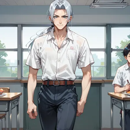shin natsume, tenjo tenge, ah1, 1boy, long hair, gray hair, mouth closed, parted bangs, score_9, score_8_up, score_7_up, score_6_up, source_anime, white shirt, gray eyes, ponytail,