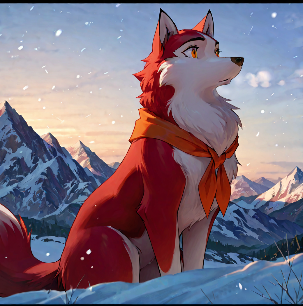 TAGS 1girl, jenna\(balto\), amber eyes, animal, two tone fur, red fur, canine, neckerchief,