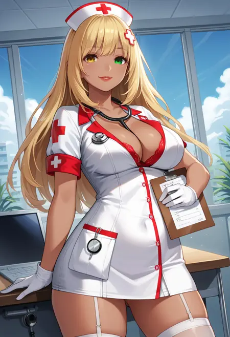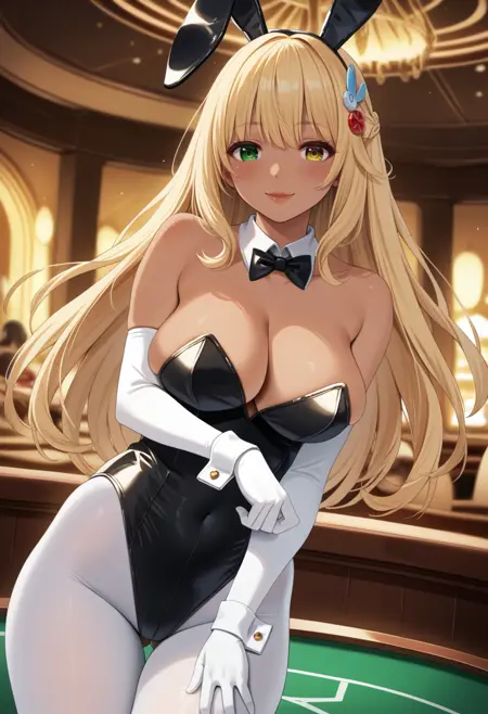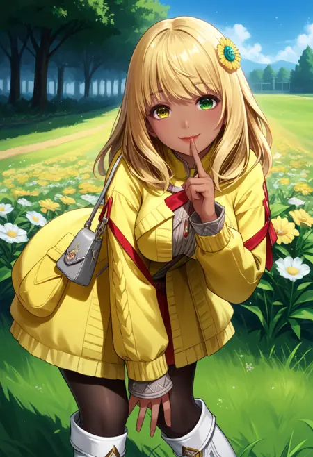 人类:["qbhuman, yellow jacket, blonde hair, long hair, dark-skinnded female, heterochromia, green eyes, yellow eyes, hair ornament, yellow coat, handbag, black pantyhose, knee boots, white legwear"]