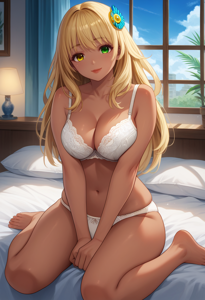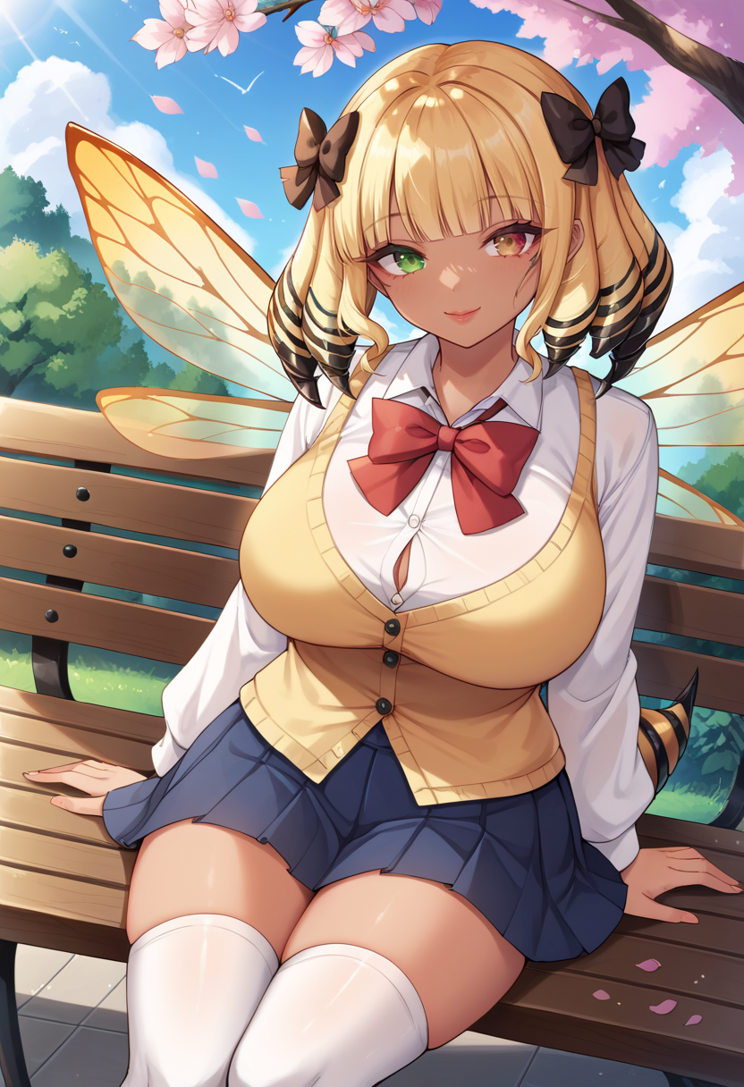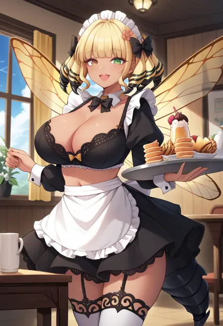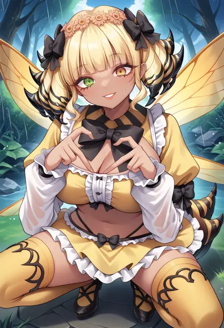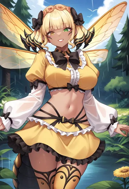 兽类:["qbee, drill hair, blonde hair, heterochromia, green eyes, yellow eyes, multicolored hair, blunt bangs, arthropod girl, stinger, tail, yellow dress, crop top, midriff, frilled skirt, frills, white sleeves, long sleeves, puffy sleeves, yellow thighhighs, fairy wings, insect wings, black bow, hair bow, hair ornament, hair flower, dark-skinned female"]