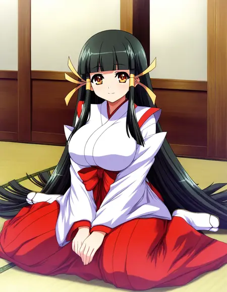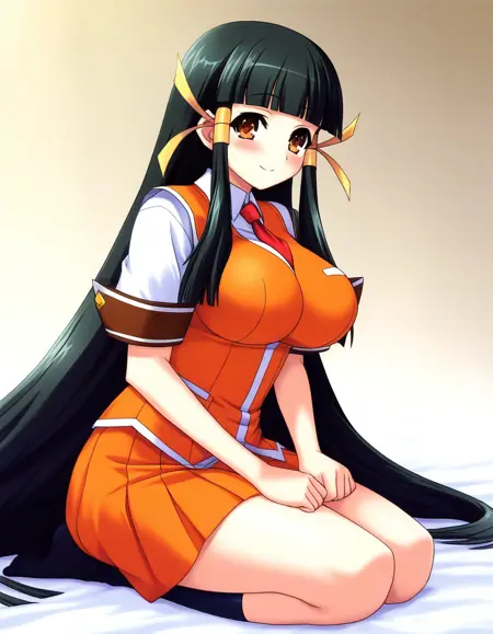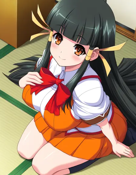 Kasuga_Maori(Arcana_Heart3), 1girl, solo, very long hair, black hair, large breasts, bangs, yellow ribbon, hair ribbon, brown eyes, hair tubes,