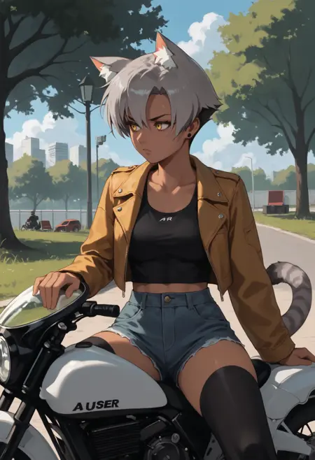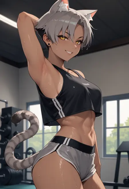 常に必要: "KaraVert, 暗色肌の女性, 動物の耳, 縞模様の尾, 灰色の尾, 黄色い目, 灰色の髪, 短髪, ピアス"、正確さを求める場合は "黒いネイル" を追加してください。