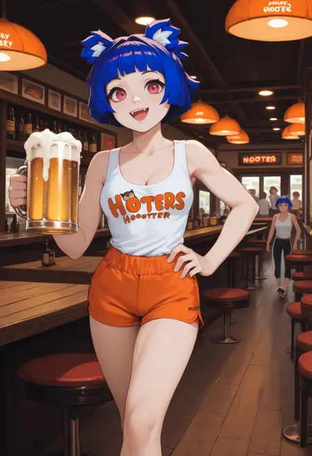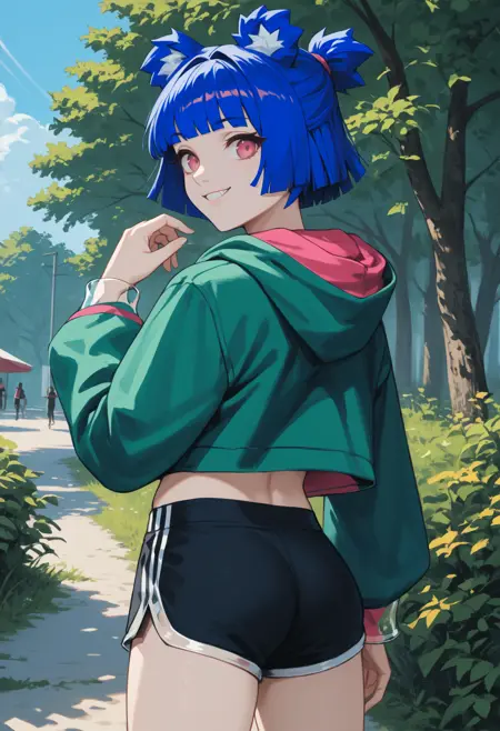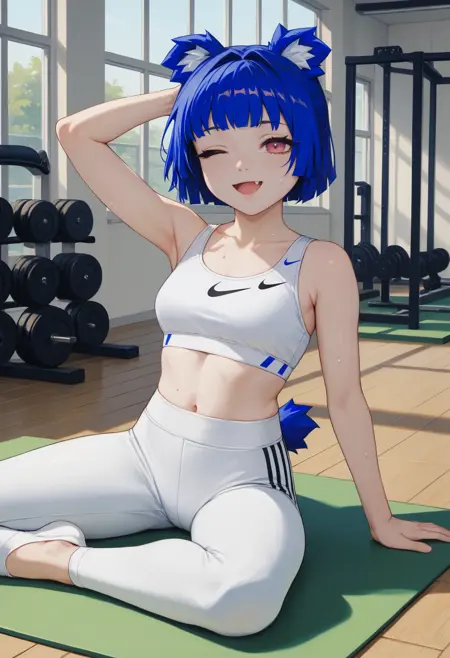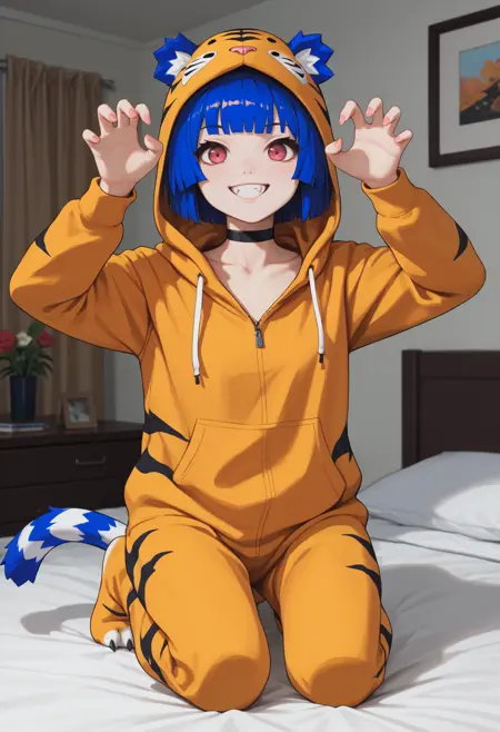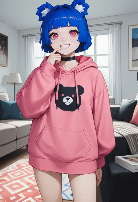始终需要:"GrisVert, 动物耳朵, 熊尾巴, 粉红色眼睛, 蓝色头发, 短发",为提高准确性可添加 "蓝色指甲, 尖牙"。