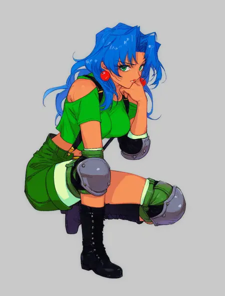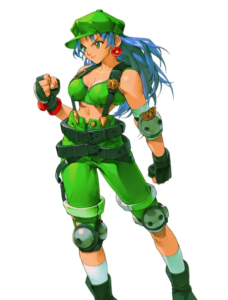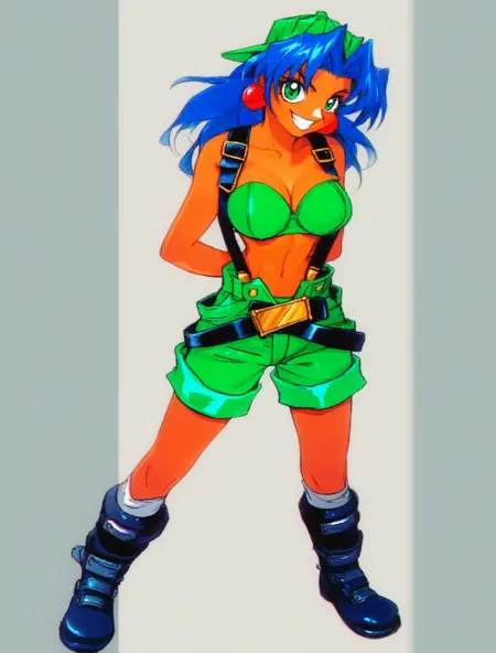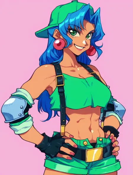 緑の目、青い髪、赤いイヤリング、逆さ向きの緑の野球キャップ、緑のショート丈トップス、ピンクのバトンを保持、肘当て、緑のショートパンツ、レザーの黒ベルト、黒いサスペンダー、ゴールドの星