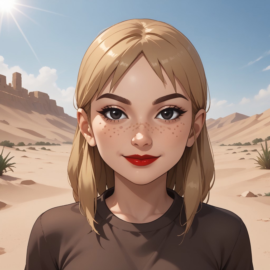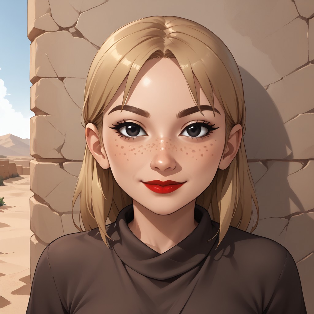wii, mii, wii sports, female mii, 1girl, cute, blonde hair, brown eyebrows, black eyes, freckles, red lips, lipstick, brown clothing, light brown long skirt, barefoot, breasts, nintendo mii, modern_mii, classic_mii, Nix_(OC_Mii)