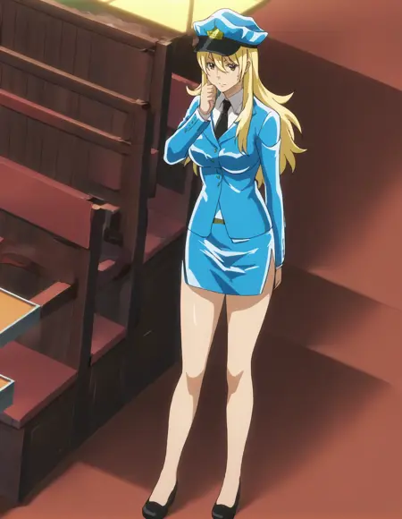 警察制服:警察制服、黑色领带、夹克、蓝色头饰、警帽、蓝色裙子、铅笔裙、侧开叉