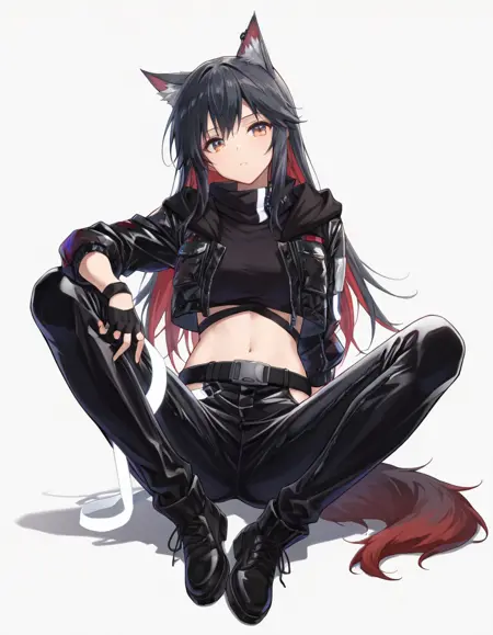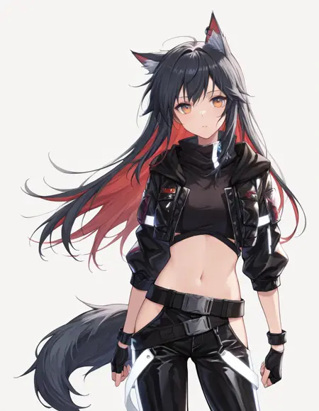 Quadrant, cropped jacket, colored inner hair, red hair, QB jacket, QB shirt, QB gloves, QB pants, QB belt, hip vent