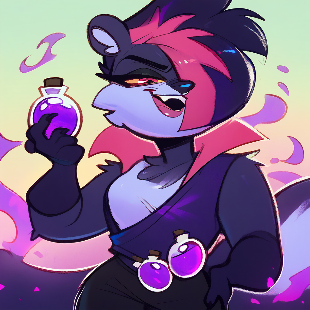 《Indigo Park》游戏中的反派角色——臭鼬萨勒姆,是一位拥有神秘过往与动机的古老炼金术士。请在标准的PonyDiffusion v6前缀后添加“萨勒姆臭鼬”: