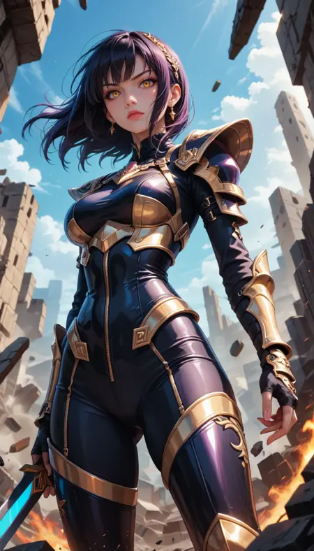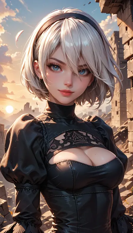 예시: score_9, score_8_up, score_7_up, Portrait, yorha no. 2 type b, 짧은 흰색 머리, 검은 드레스, 헤어밴드, 옷 자르기, 가슴 자르기, 풍성한 소매, 검은 헤어밴드, 깃털 장식 소매, 줄리엣 소매, 입 아래 점, 일몰, 배경에 잔해, 4n1v3rs3, 심도, 역동적 각도, 패션 사진, 선명, 하이퍼디테일:1.15