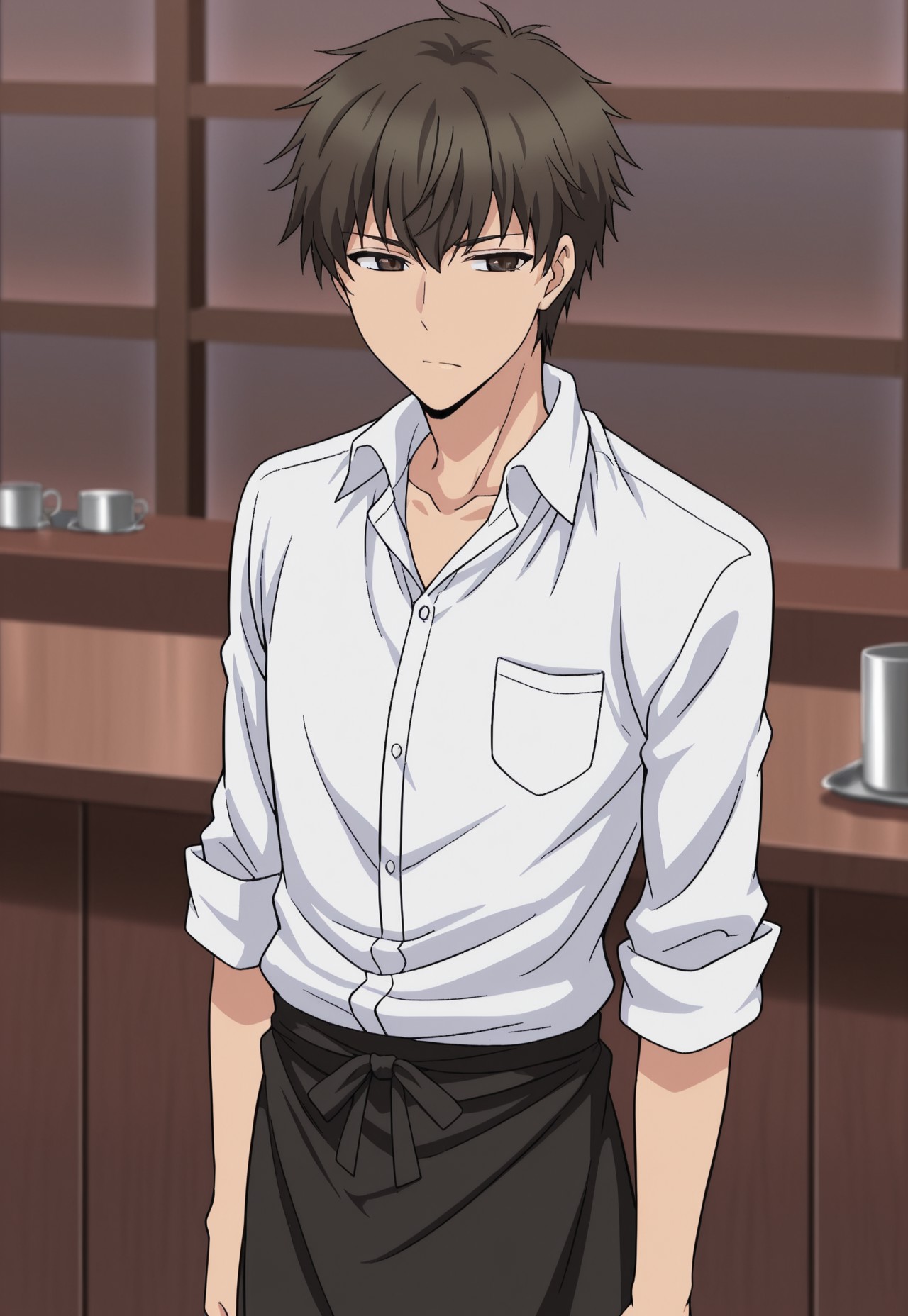 1boy, 男性焦点, 单人, 棕色眼睛, 棕色头发, 白色衬衫, 有领衬衫, 锁骨, 袖子卷起, 黑色裤子,