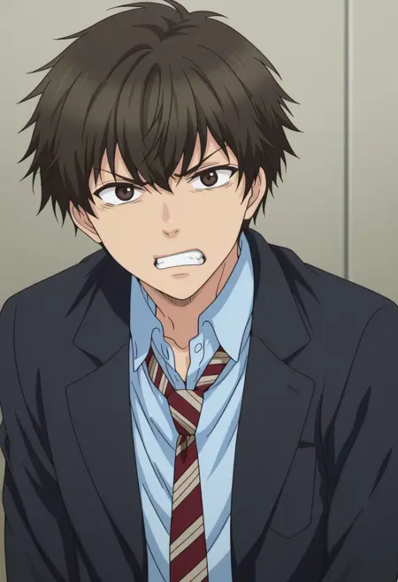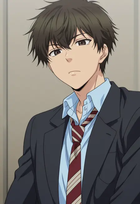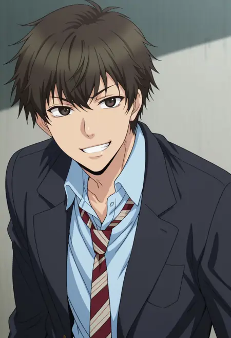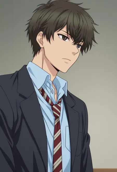 1boy, 男性焦点, 单人, 棕色眼睛, 棕色头发, 校服, 蓝色衬衫, 有领衬衫, 条纹领带, 红色领带, 黑色夹克, 开襟夹克, 腰带, 黑色裤子,