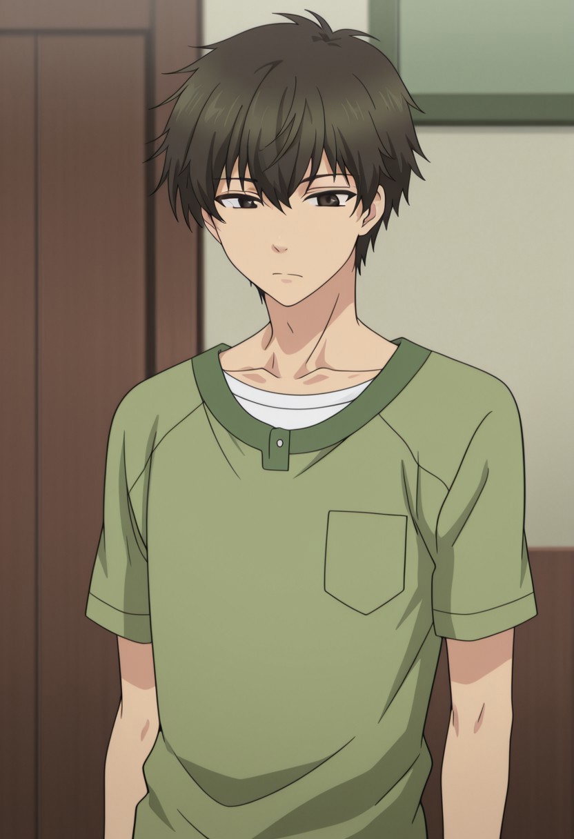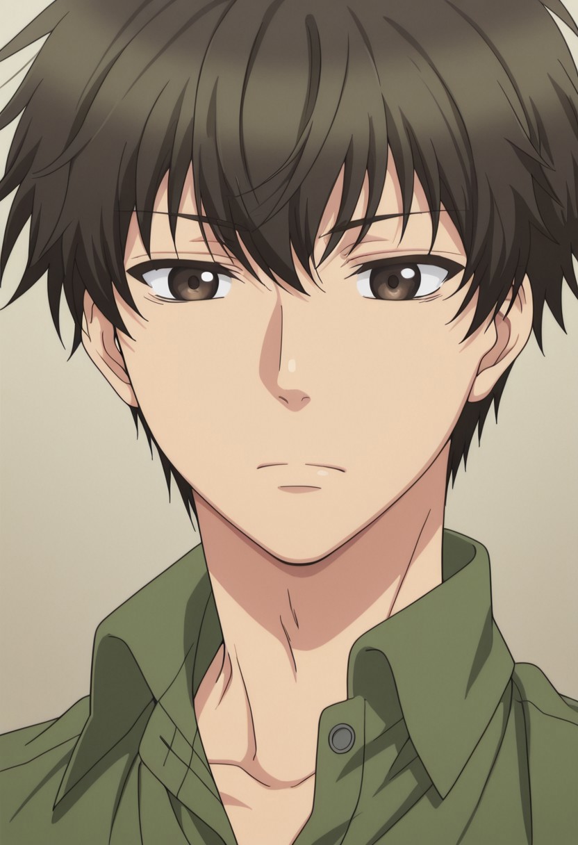 1boy, 男性焦点, 单人, 棕色眼睛, 棕色头发, 绿色衬衫, 有领衬衫, 短袖,