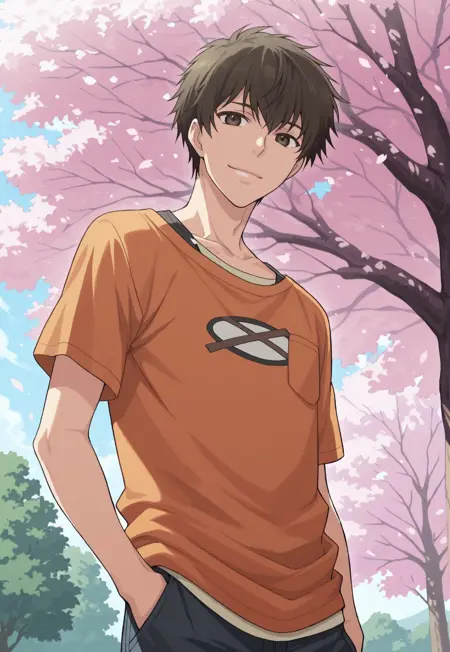 akikaido, 1boy, 男性焦点, 裤子, 棕色眼睛, 黑发, 上衣, 鞋子, 牛仔裤, 运动鞋, 牛仔布, 短袖T恤, 橙色上衣, 印花衬衫,