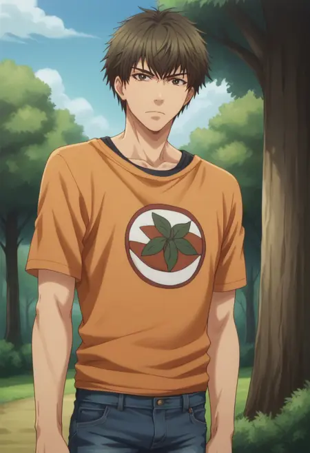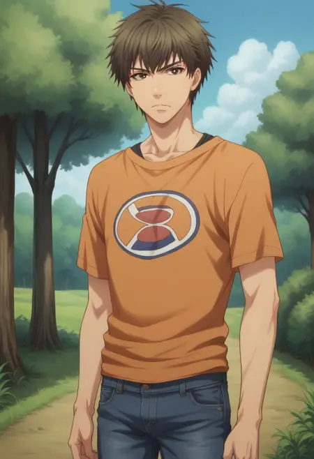 1boy, male focus, solo, brown eyes, brown hair, orange shirt, t-shirt, undershirt, jeans,