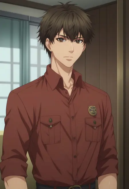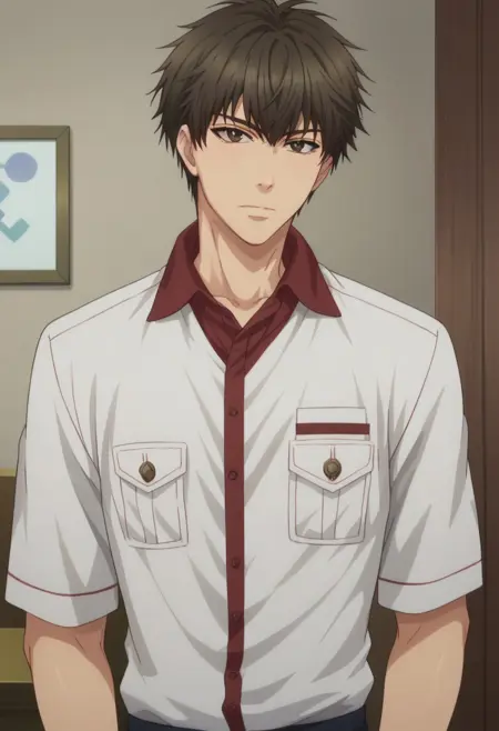 1boy, male focus, solo, brown eyes, brown hair, white shirt, collared shirt, collarbone, sleeves rolled up, black pants,