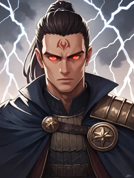 ((exarkun)), man, ponytail, red forehead tattoo, cape