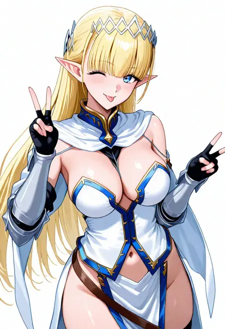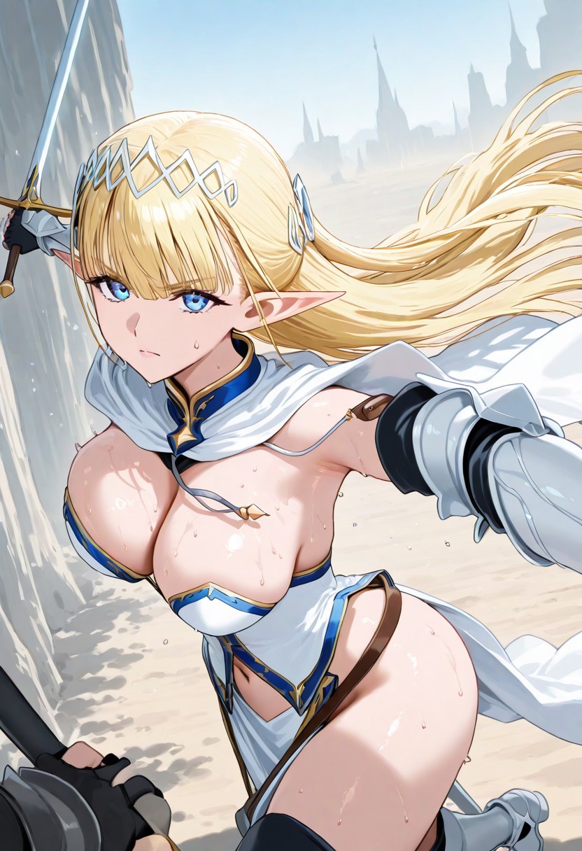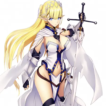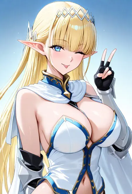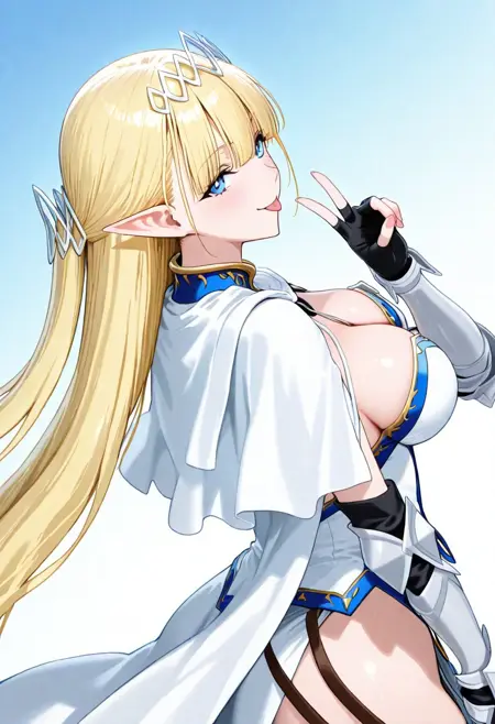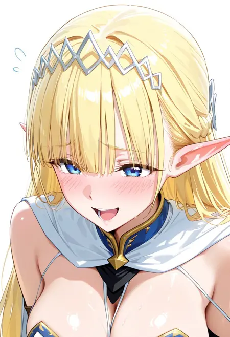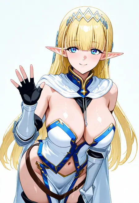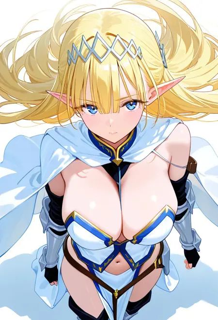seras_ashrain, 1girl, pointy ears, blonde hair, blue eyes, elf, long hair, bangs, breasts, large breasts,