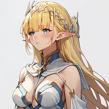 seras_ashrain, 1girl, pointy ears, blonde hair, blue eyes, elf, long hair, bangs, breasts, large breasts,