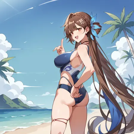 SusHi3, Shg_Swm, brown eyes, brown hair, long hair, braid, twintails, blue hair, streaked hair, long braid, blue one-piece swimsuit, two-tone swimsuit, white swimsuit, red string, red ribbon, red choker, red bracelet, red thigh strap, side cutout, panty straps, blue hair ornament, hairclip,