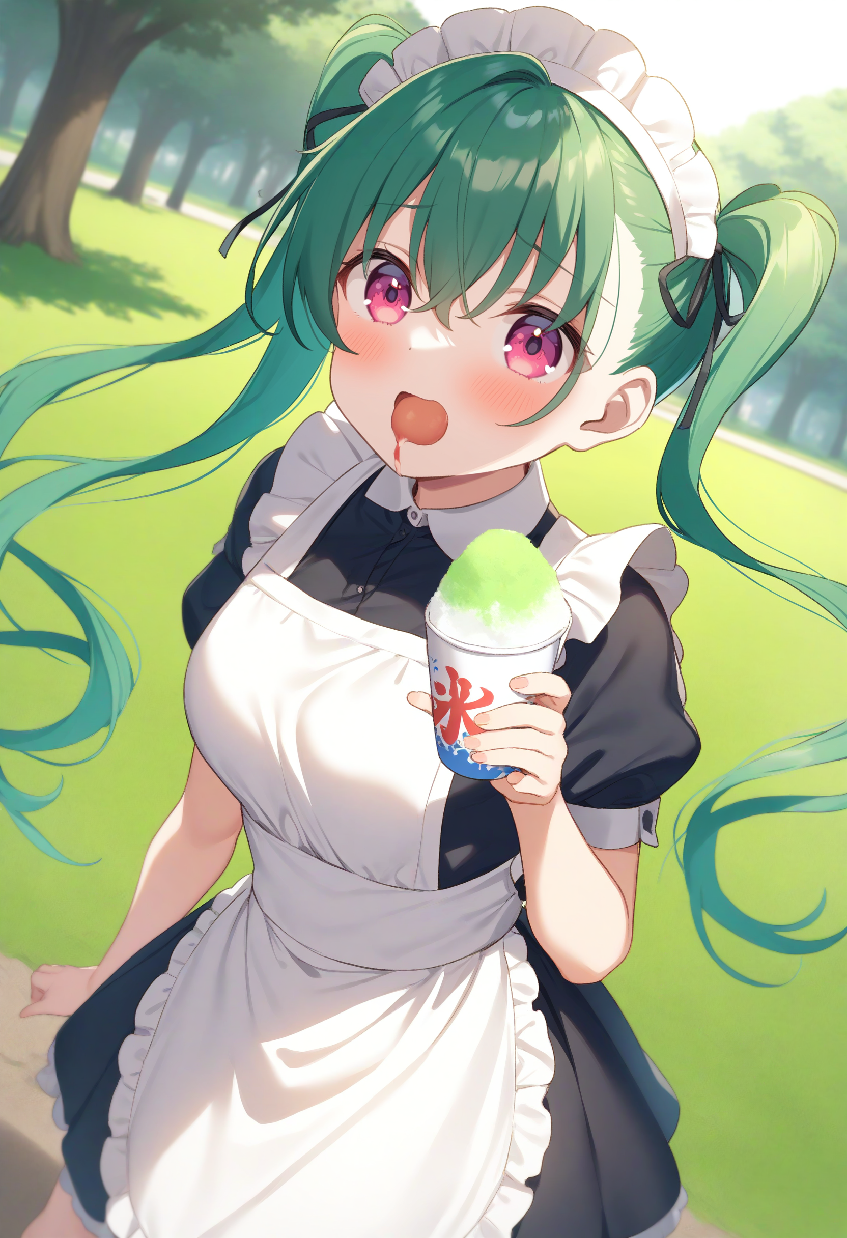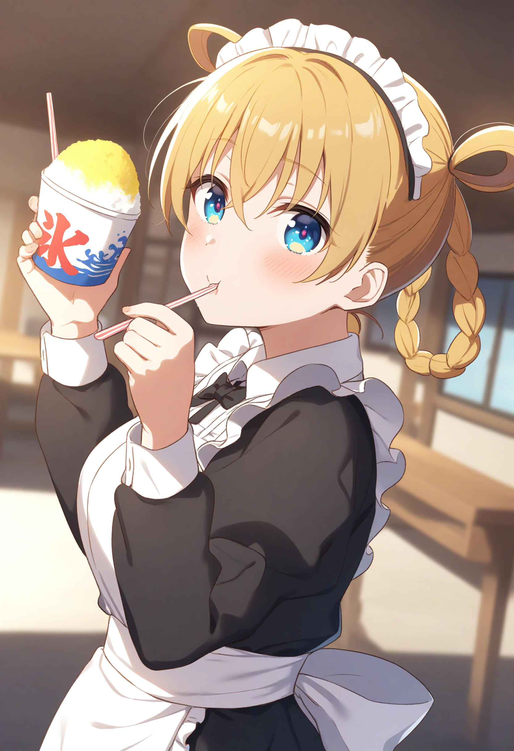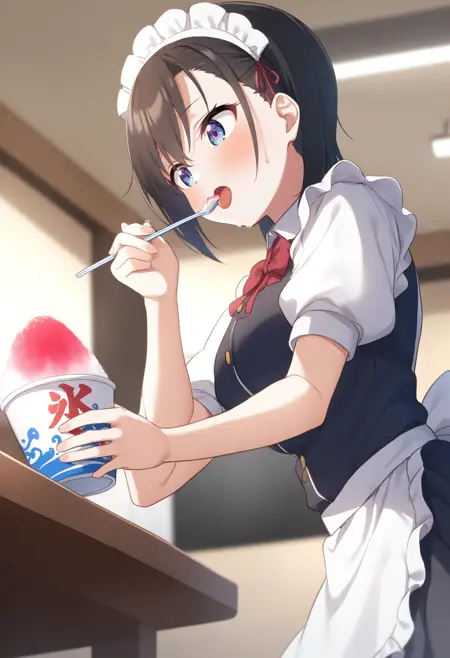 仅使用触发词时,角色大多只会拿着杯子,若想表现食用动作,请加入“holding drinking straw”、“spoon straw”或“eating”。