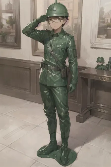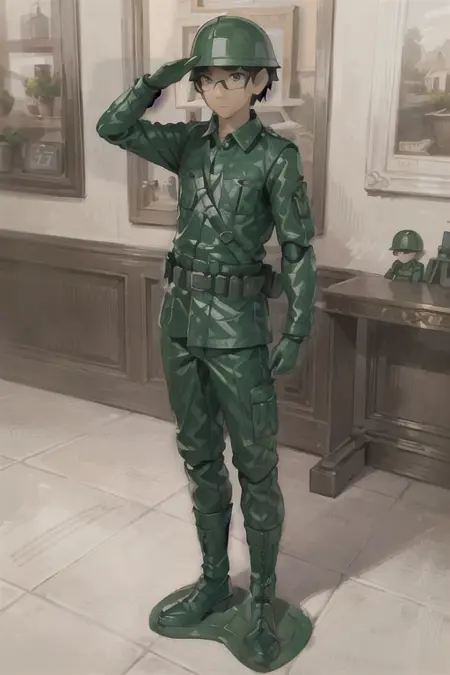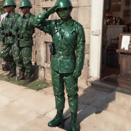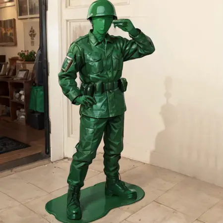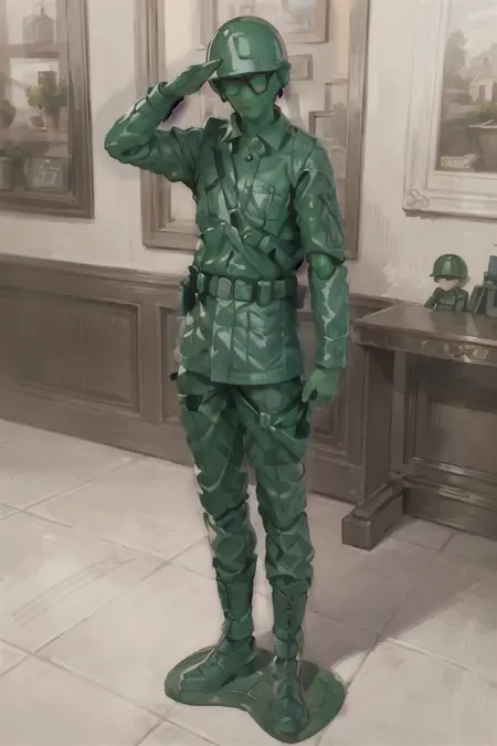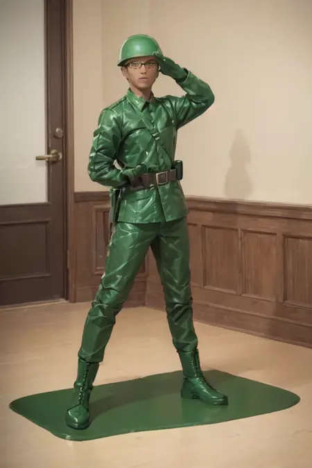 <lora:Plastic Green Army Toy Soldier Costume:0.6>