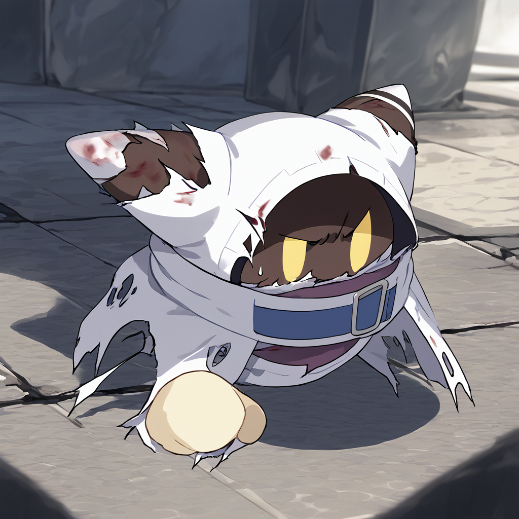 白い衣装の場合は、否定プロンプトに青を追加すると効果があります。片方の耳の部分のフードが裂けた状態にする方法はわかりません。おそらく、KOHYAで学習するモデルにそのバージョンをさらに追加できるでしょう。
