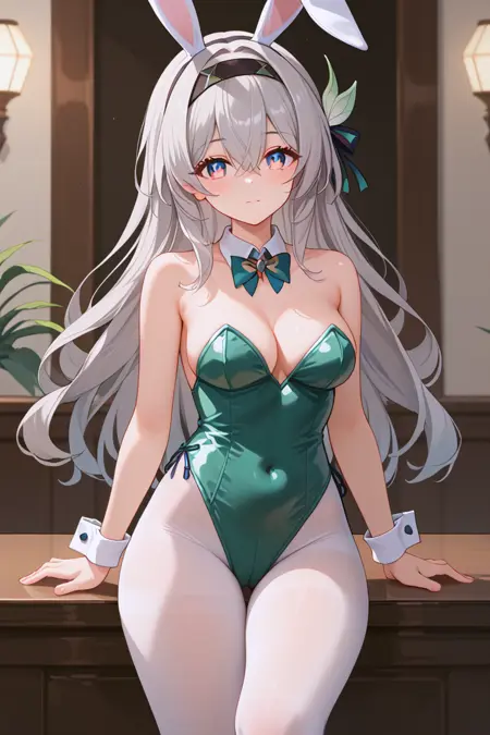 FireflyBren, 1girl, 긴 머리, 파란 눈, 회색 머리, 눈 사이의 머리, 허벅지까지 오는 양말, 중간 정도의 가슴, 키가 큰 여자