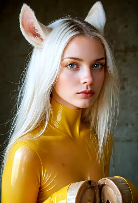 white horse-like ears, white horse-like tail, red eyes, white hair,
