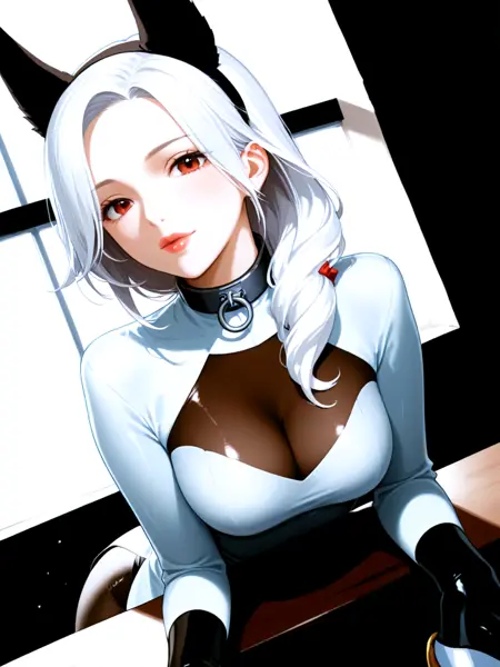 white horse-like ears, white horse-like tail, red eyes, white hair,