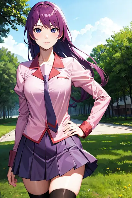 outfit1 (school uniform / long sleeves)sh1, senjougahara hitagi, long hair, long sleeves, necktie, school uniform, pleated skirt, juliet sleeves, black thighhighs, pink shirt