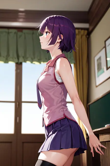 outfit3 (schoolo uniform / sleeveless)sh1, senjougahara hitagi, short hair, sleeveless, necktie, school uniform, pleated skirt, black thighhighs, pink shirt