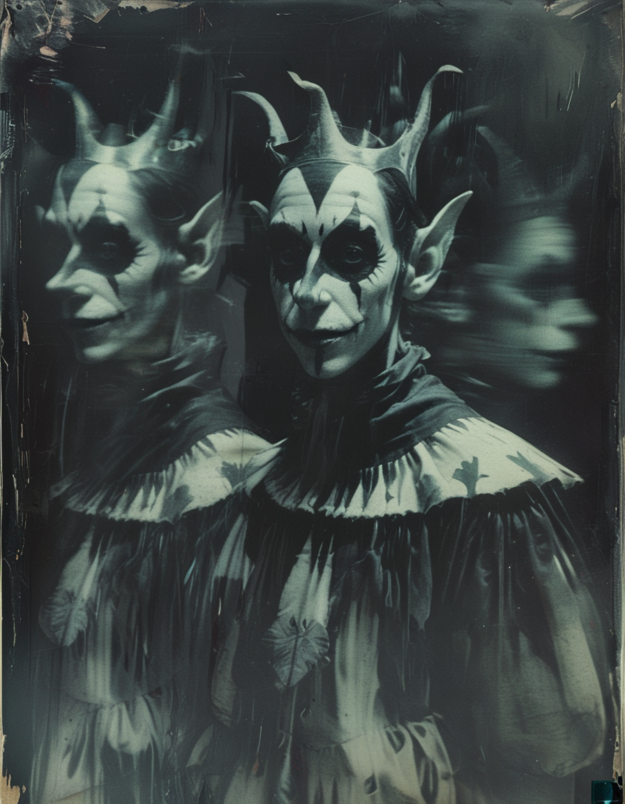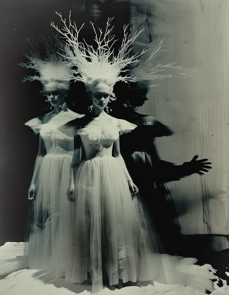 被写体が異なる時刻で複数のバージョンに分裂する、不気味なモノクロ写真スタイル。被写体の複製は、異なる姿勢、ぼやけた状態、半透明、異なるサイズ、あるいは影のように見えることがある。