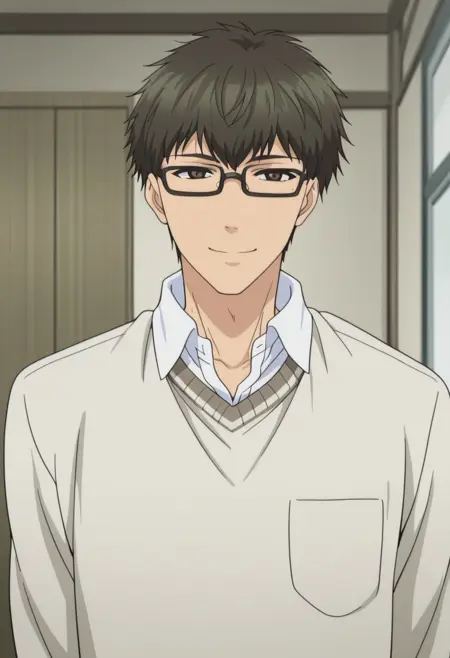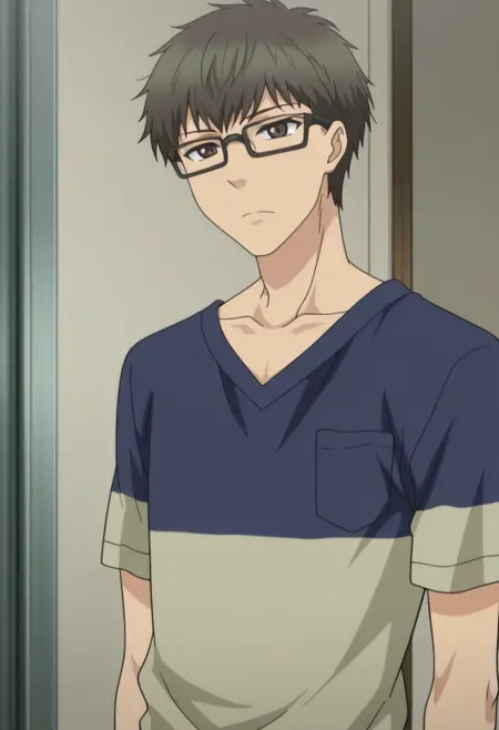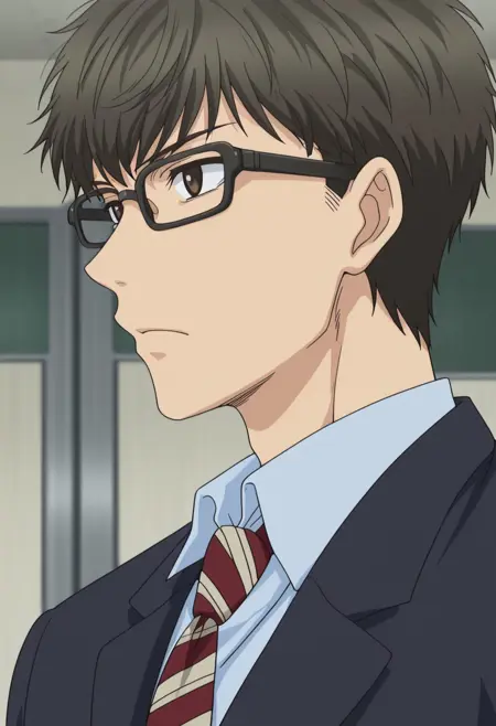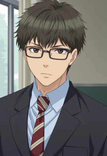 1boy, male focus, solo, brown eyes, glasses, brown hair, school uniform, blue shirt, collared shirt, striped necktie, red necktie, black pants,
