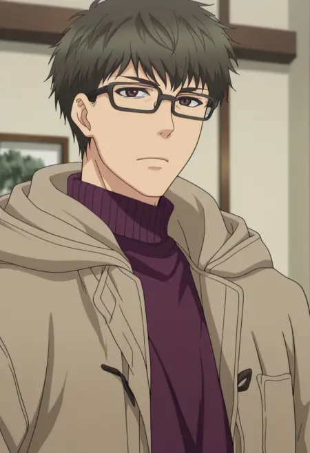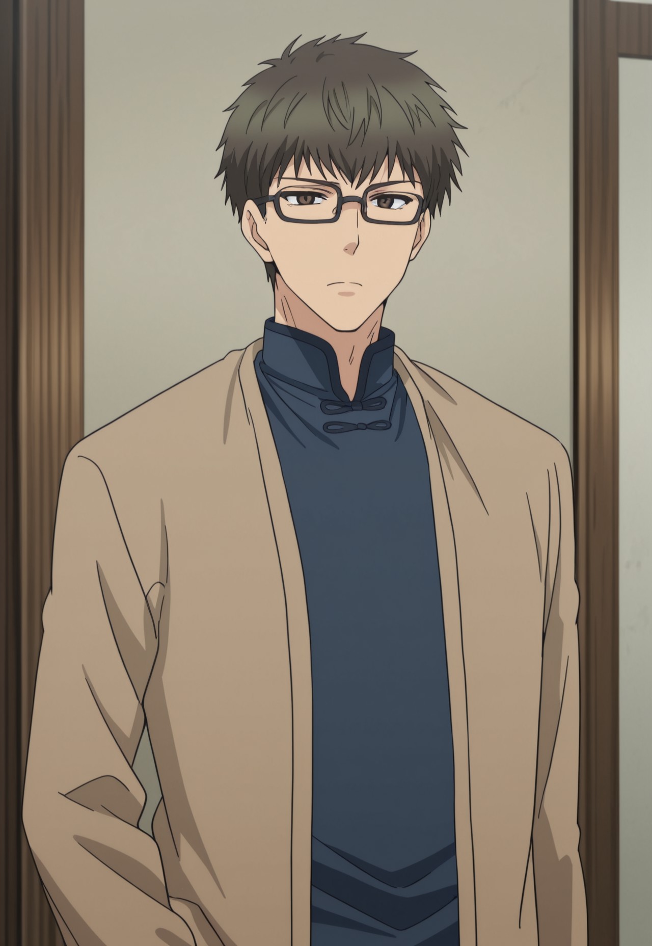 1boy, male focus, solo, brown eyes, glasses, brown hair, blue shirt, mandarin collar, brown jacket, open jacket, pants,