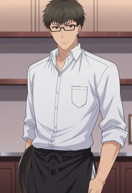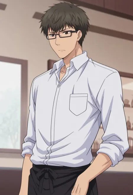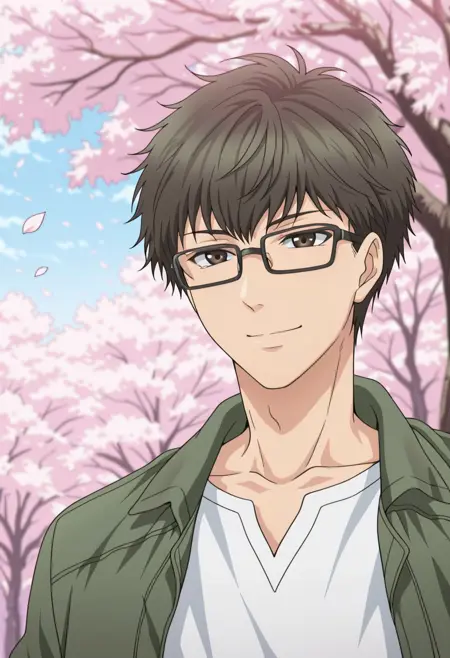 1boy, male focus, solo, brown eyes, glasses, brown hair, collarbone, white shirt, green jacket, open jacket, short sleeves,