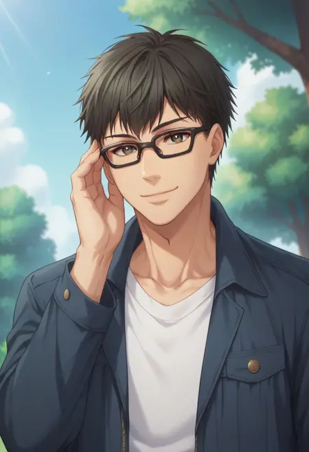 1boy, male focus, solo, brown eyes, glasses, brown hair, collarbone, white shirt, green jacket, open jacket, short sleeves,