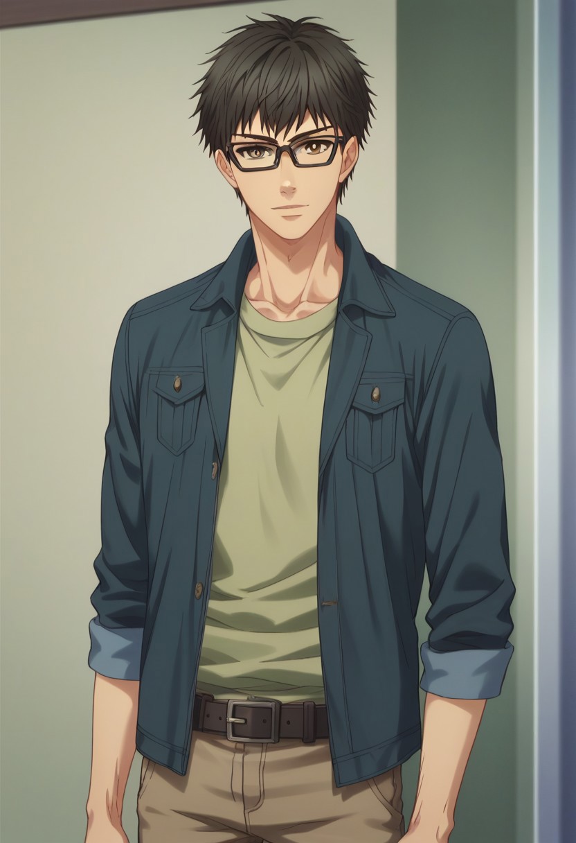 shimakaido, 1boy, 眼镜, 男性焦点, 裤子, 棕色眼睛, 皮带, 衬衫, 夹克, 绿色衬衫, 黑框眼镜, 黑色头发, 棕色裤子, 棕色鞋子, 鞋子, 棕色皮带,