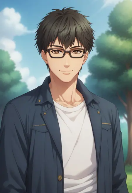 1boy, 男性焦点, 单人, 棕色眼睛, 眼镜, 棕色头发, 校服, 蓝色衬衫, 有领衬衫, 条纹领带, 红色领带, 黑色裤子,