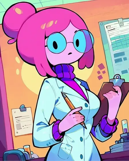 - 科学家 - “labcoat, purple sweater, turtleneck, glasses, round glasses”