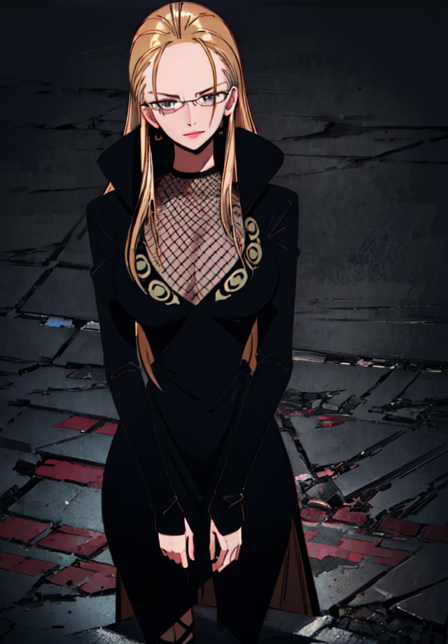 a woman, long blonde hair, fishnet stockings, glasses