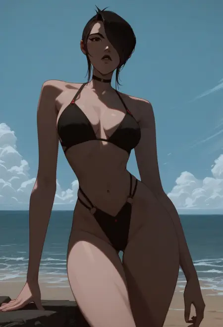 すべてに使える汎用トリガーワード: - paigetu、黒髪、片目に髪がかかる、茶色の目