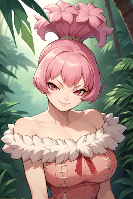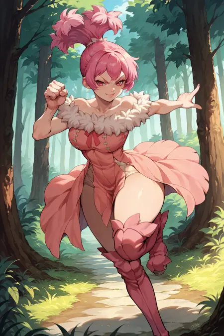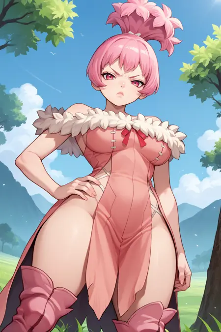 彼女の典型的な外見には、「ファーのトリム、裸の肩、ピンクのドレス、ピンクのブーツ、太ももブーツ」を追加してください。