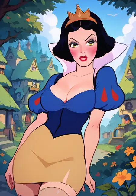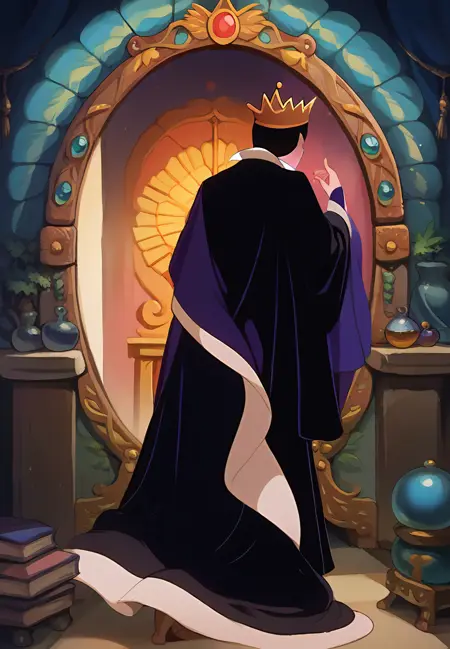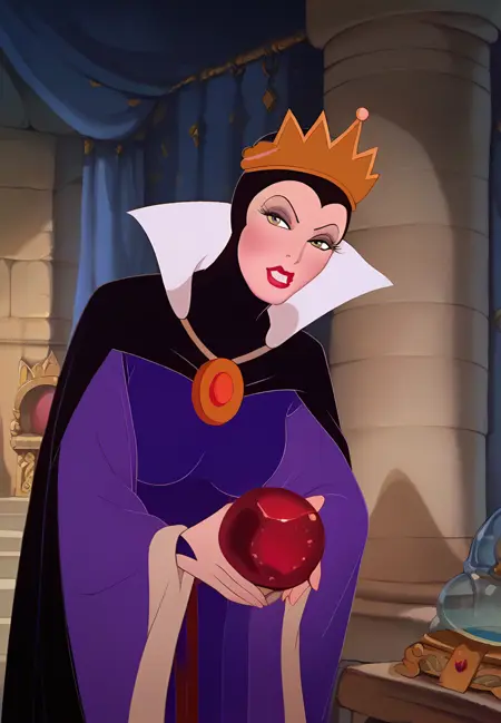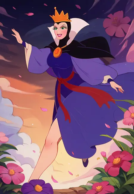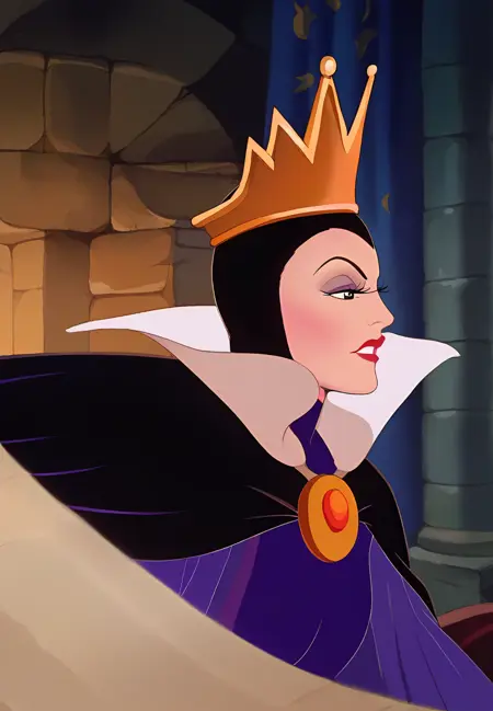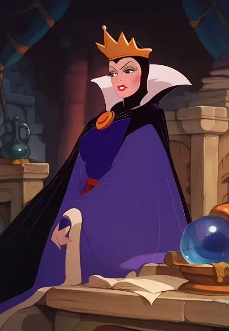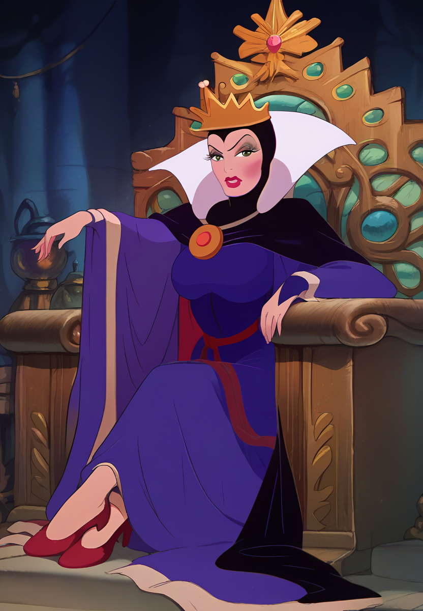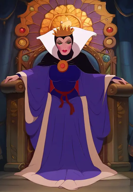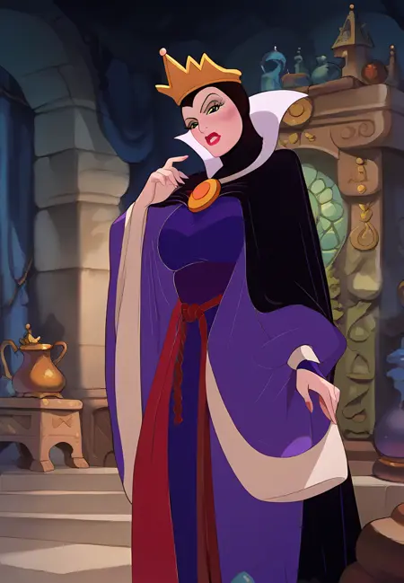 Pony version of my lora of the evil queen from Snow White. The lora was trained with similar images in the animation style of the movie. Both the movie outfit and several alternate outfits have been trained. I also trained with a short and long hairstyle. If you want the movie outfit, try adding "white ruff, purple robes, black cape, gold crown, wide sleeves" to the prompt.